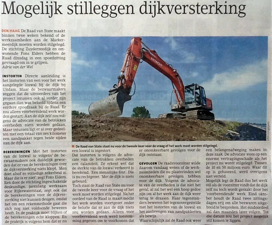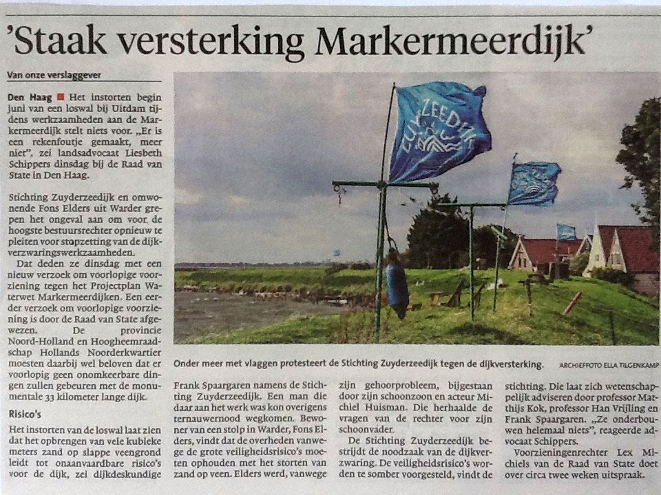 De procedure aangespannen door bewoners van de Markermeerdijk, de Stichting Zuyderzeedijk en de IJsselmeervereniging tegen de dijkversterkingsplannen van het Hoogheemraadschap Hollands Noorder Kwartier (HHNK) zal pas op 29 en 30 oktober voorkomen bij de Raad van State. Voorafgaand aan deze bodemprocedure mocht de Alliantie Markermeerdijken, waarin het Hoogheemraadschap al voor de plannen klaar waren met de uitvoerders samenwerkt van de rechter toch beginnen met voorbereidende werkzaamheden voor de dijkversterking. Op voorwaarde dat de werkzaamheden geen “onomkeerbare”gevolgen zouden hebben voor de dijk en alles weer in de oude staat hersteld zou kunnen worden.