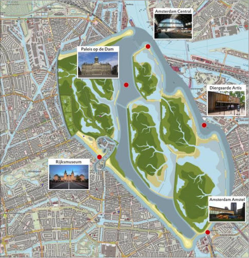 Indicatie van de schaal: de vijf eilanden van Marker Wadden geprojecteerd over Amsterdam