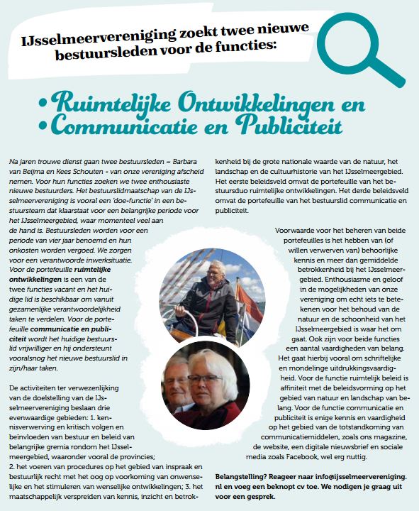 Na jaren trouwe dienst gaan twee bestuursleden – Barbara van Beijma en Kees Schouten – van onze vereniging afscheid nemen. Voor hun functies zoeken we twee enthousiaste nieuwe bestuurders. Het bestuurslidmaatschap van de IJsselmeervereniging is vooral een ‘doe-functie’ in een bestuursteam dat klaarstaat voor een belangrijke periode voor het IJsselmeergebied, waar momenteel veel aan de hand is. Bestuursleden worden voor een periode van vier jaar benoemd en hun onkosten worden vergoed. We zorgen voor een verantwoorde inwerksituatie. Voor de portefeuille ruimtelijke ontwikkelingen is een van de twee functies vacant en het huidige lid is beschikbaar om vanuit gezamenlijke verantwoordelijkheid taken te verdelen. Voor de portefeuille communicatie en publiciteit wordt het huidige bestuurslid vrijwilliger en hij ondersteunt vooralsnog het nieuwe bestuurslid in zijn/haar taken.