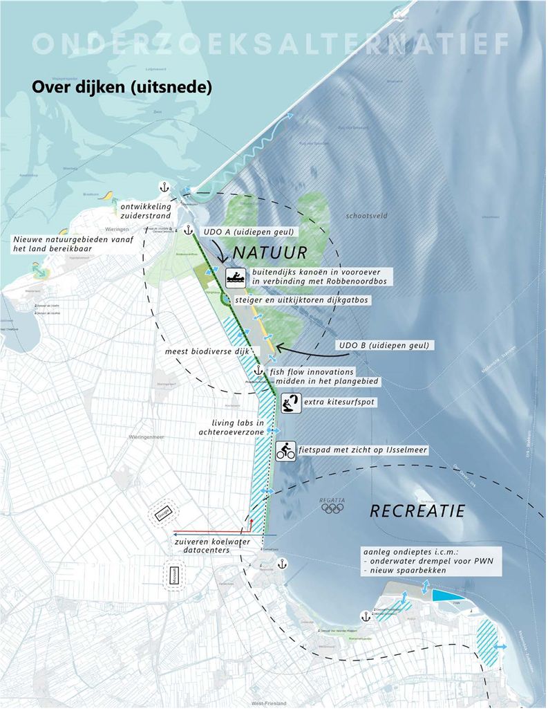 Het gaat hier vooral om ideeën om per dijktype de mogelijkheden van natuurlijke overgangen zoals overstromingsgraslanden, helofytenmoeras en mogelijkheden achter de dijken te benutten. Het gaat dan voor al om de Wieringermeerdijk een veel natuurlijker “profiel ”te geven. Tussen Enkhuizen en Medemblik worden weinig veranderingen voorgesteld vanwege de vele vaarbewegingen.