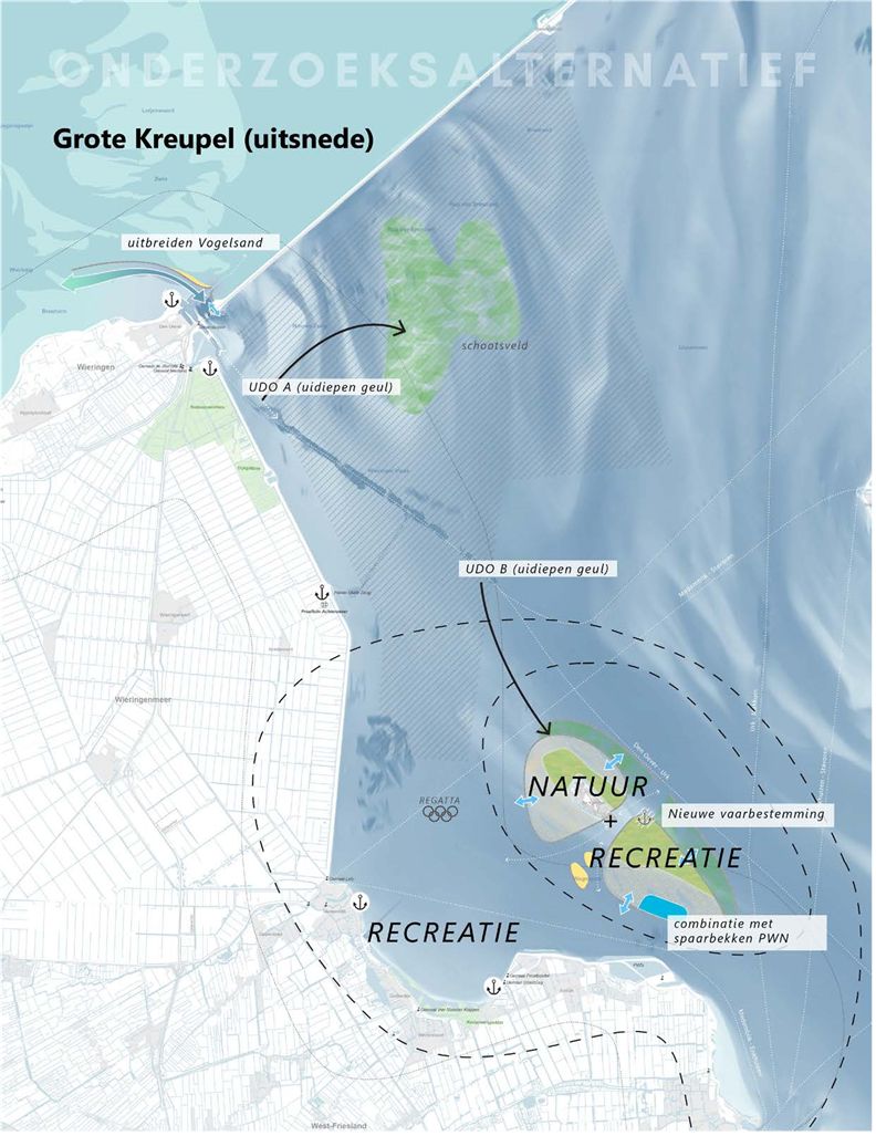 Het bestaande natuurgebied de Kreupel, nog niet zo lang geleden aangelegd en een belangrijk vogelbroedgebied zou kunnen worden uitgebreid en omringd met nieuwe oppervlaktes helofytenmoeras, ondieptes en overstromingsgraslanden. Door de gewenste oppervlaktes zijn echter de ondieptes rond de Kreupel onvoldoende en zullen ook op diepere plekken ondieptes en eilanden meten worden ontworpen. Hier lijken goede mogelijkheden voor recreatief medegebruik en ecotoerisme eventueel via de aanleg van een nieuwe haven. Ook zouden nieuwe spaarbekkens voor drinkwater in het plan kunnen worden opgenomen.