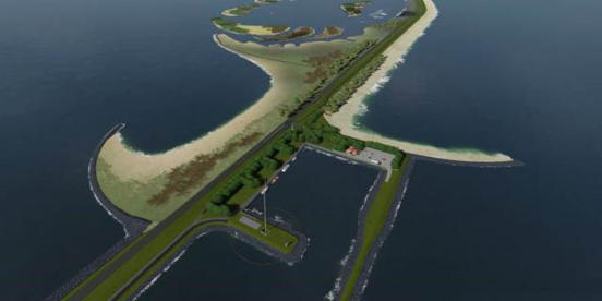 Directeur-generaal Jan Hendrik Dronkers: ‘Met dit project zorgen we op een bijzondere manier voor een veiliger achterland. De zanderige versterking is even veilig als een traditionele versterking, maar we voegen ook mogelijkheden voor natuur toe.’ Bij Trintelhaven ontwikkelt Rijkswaterstaat zogenoemde luwtegebieden, bestaande uit kleine zandplaten en ondiep water (zie impressie, bron: Royal Haskoning DHV). Hiermee wordt aangesloten op de aanleg van de Marker Wadden, even verderop, die een impuls geven aan de waterkwaliteit van het Markermeer.