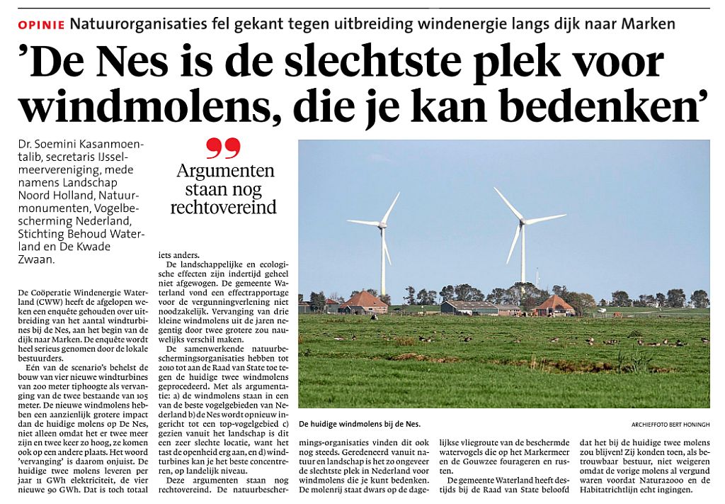 In hun reactie op de concept-RES Noord-Holland Zuid van 30-9-2020, schrijven de natuur- en milieu organisaties (Natuur-en Milieufederatie Noord-Holland, Natuurmonumenten, Landschap Noord-Holland) over de windturbines bij de Nes: